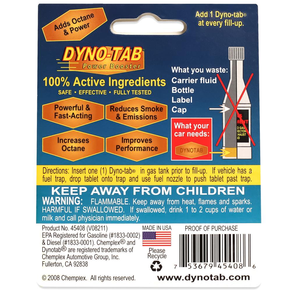 Boost octane, reduce smoke and emissions and get better mileage with Dyno-tab® fuel treatment! This convenient 8-tab tube fits easily in purse or glove box and is ready anytime you fill up. Please keep away from children.