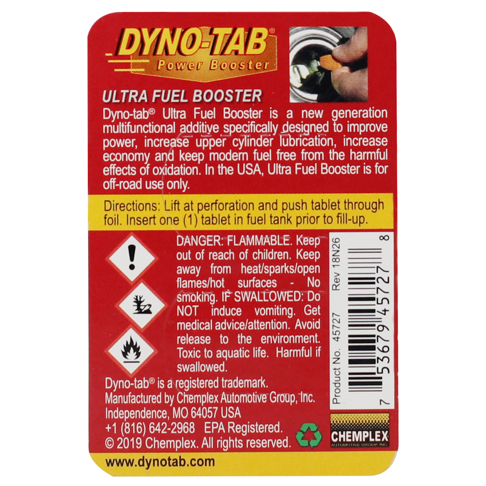 | Product Name | Dyno-tab® ULTRA Fuel Booster – 45727 - for Gasoline & Diesel Engines | 2-Tablet Card | 1 Tablet Treats 30 Liters |