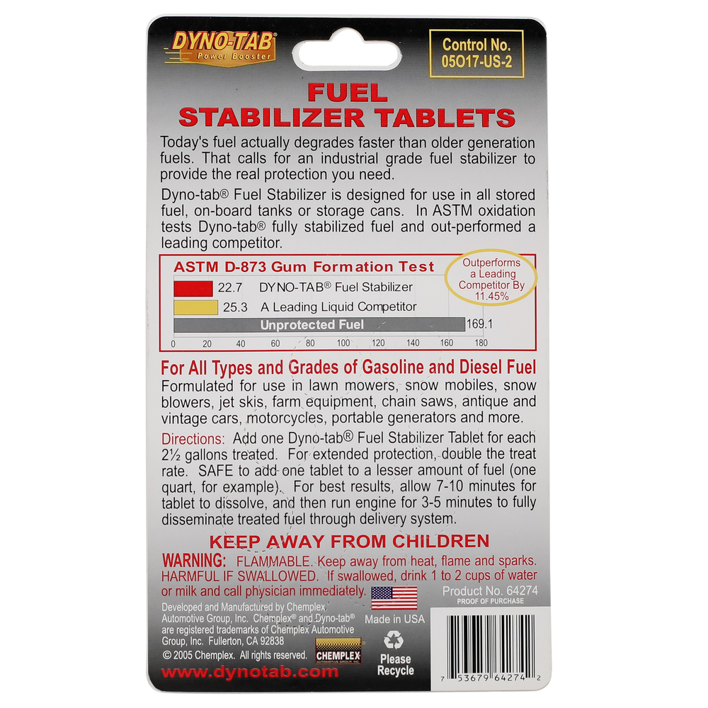 Modern gasoline and diesel fuels begin to degrade very quickly, often in a matter of weeks. Fuel that is stored can often cause stubborn starts, rough idling and smoke due to the gum and varnish that builds up over time. Dyno-tab® Fuel Stabilizer keeps fuel fresh and protects against rust and corrosion while stored. It is 100% active components in a fast-dissolving, easy-to-store tablet. Dyno-tab® Fuel Stabilizer has been shown to be superior to the leading liquid fuel stabilizer in retarding the formation of gum by 11.45%.