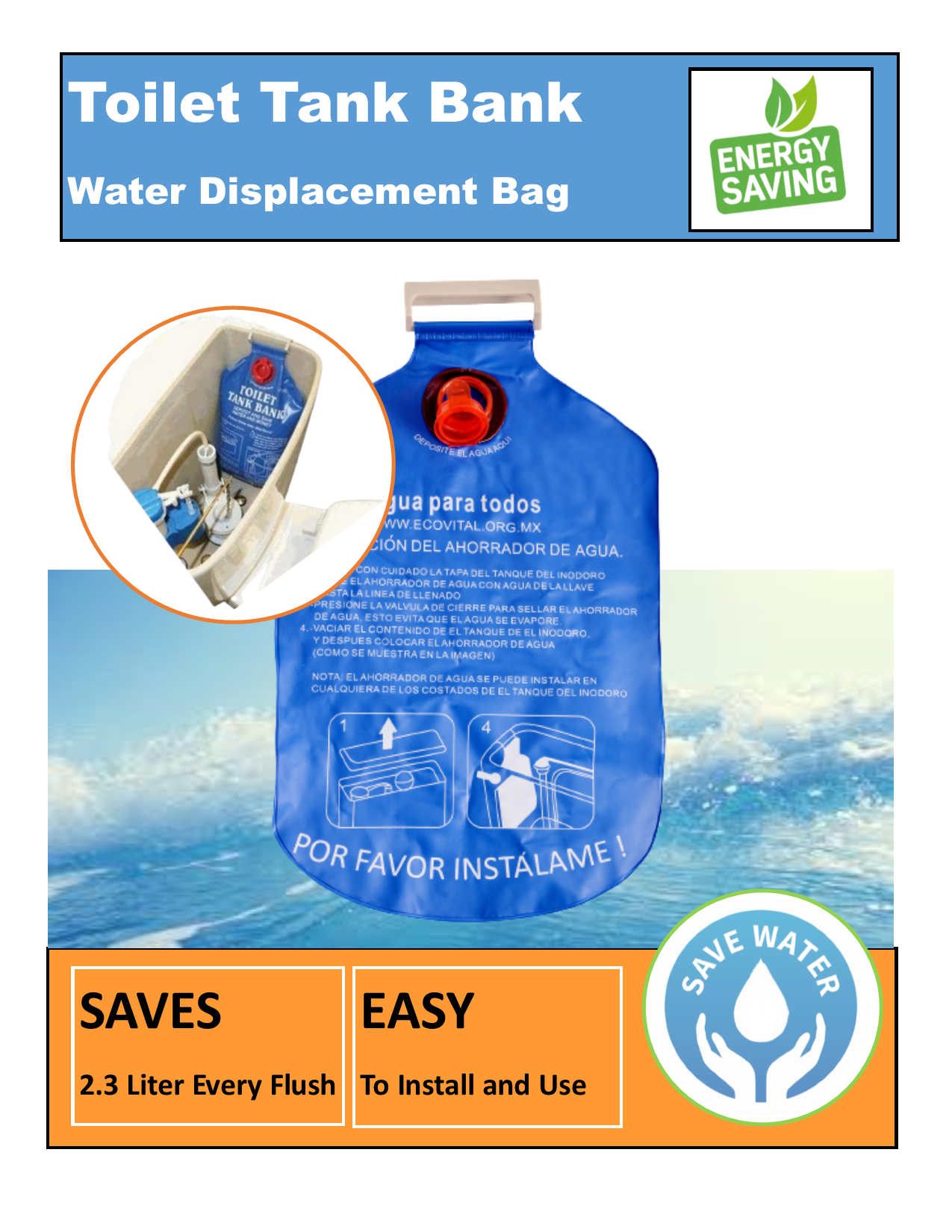 The Toilet Tank Bank is a globally trusted and proven solution for households looking to conserve water without sacrificing performance. It’s an affordable, easy-to-install product that fits inside any standard toilet tank. Just fill the bag with water and hang it — it starts saving up to 2.3 liters per flush right away.